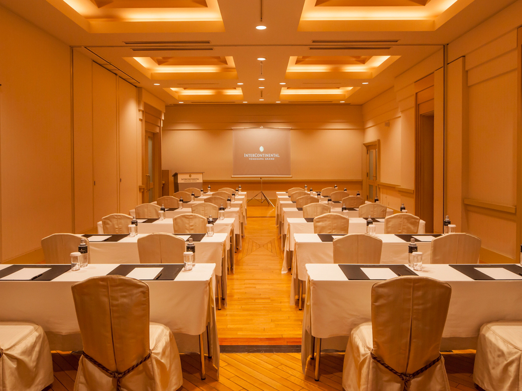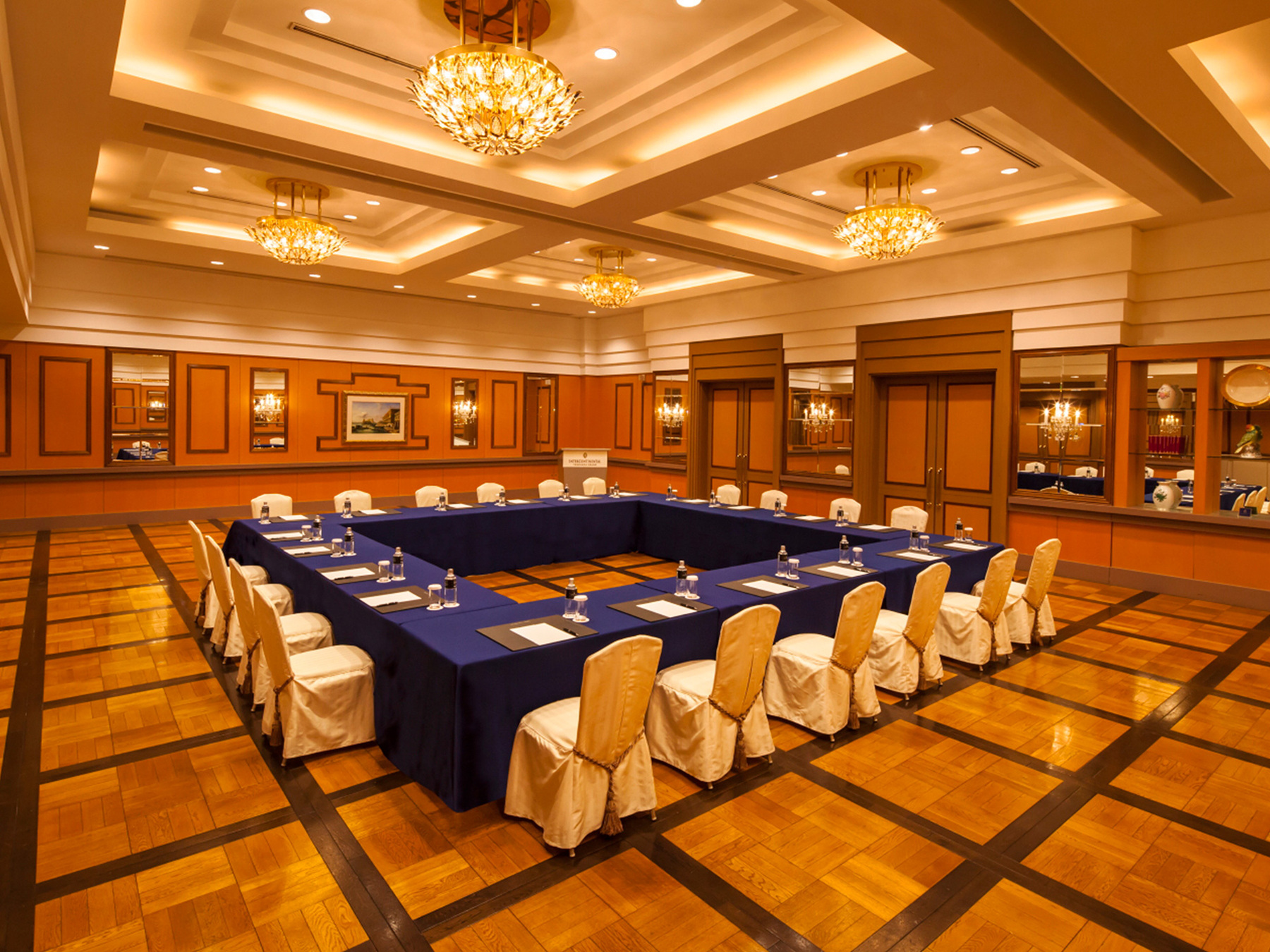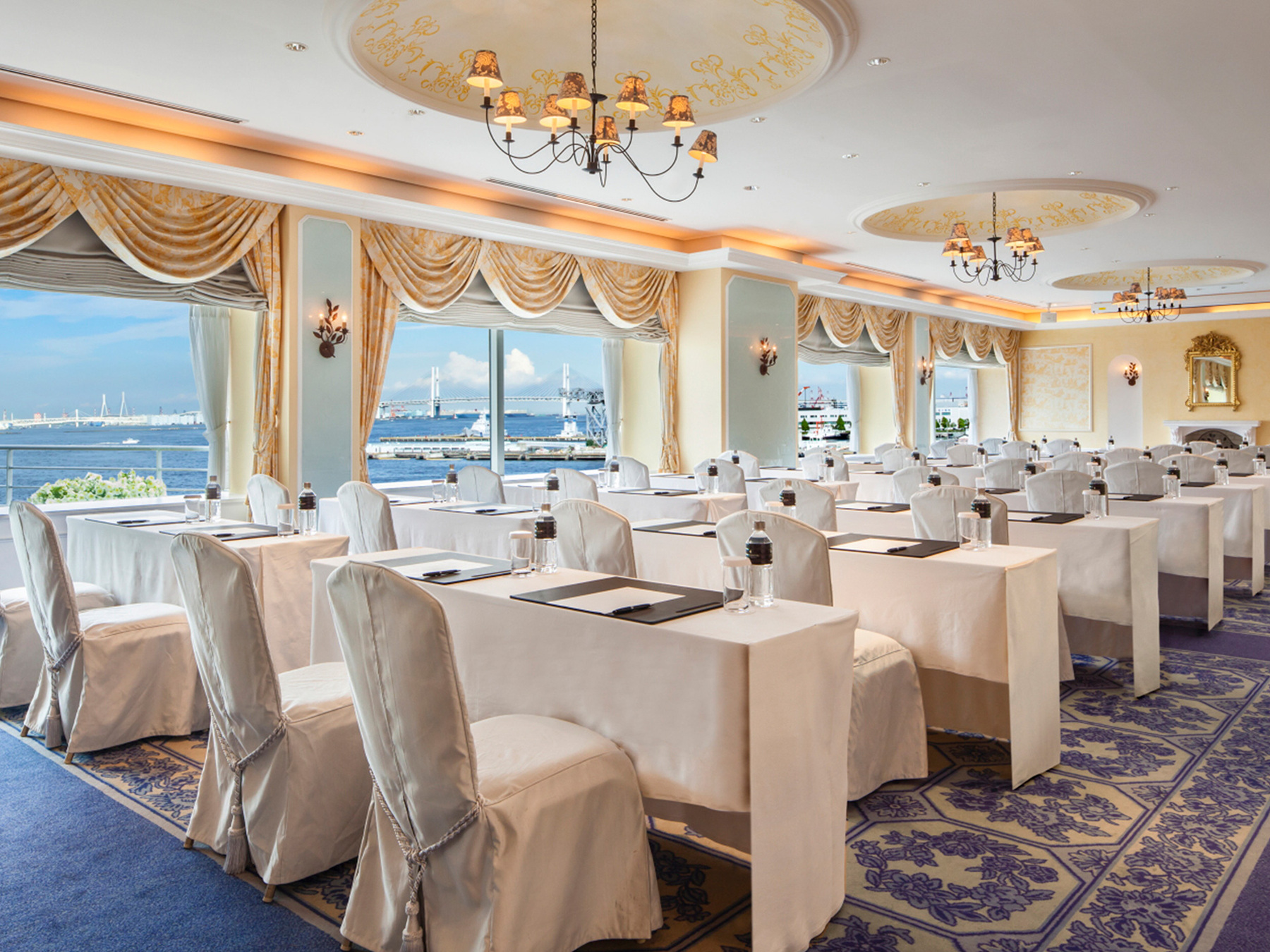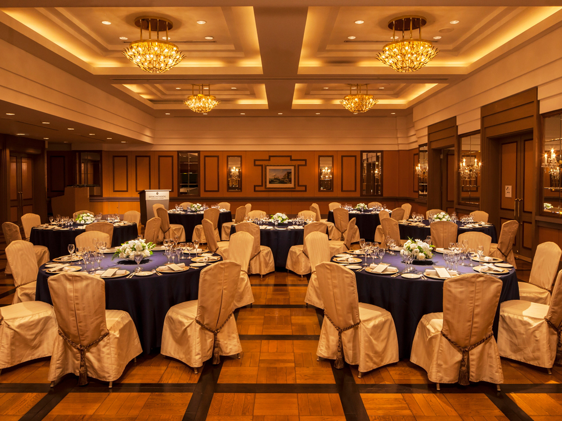 ホテル随一の広さを誇るボールルーム。晩餐会、展示会、国際会議、周年パーティ、婚礼など、700名様までのあらゆる用途にご利用いただけます。規模や目的に応じ、3室に分割してご利用いただけるうえ、隣接する横浜国際会議平和場との併用でさらに大型のパーティーやイベントにも対応することが可能です。ヨーロッパの舞踏会場を思い起こさせる豪奢な会場で、心に残るひとときをお過ごしください。