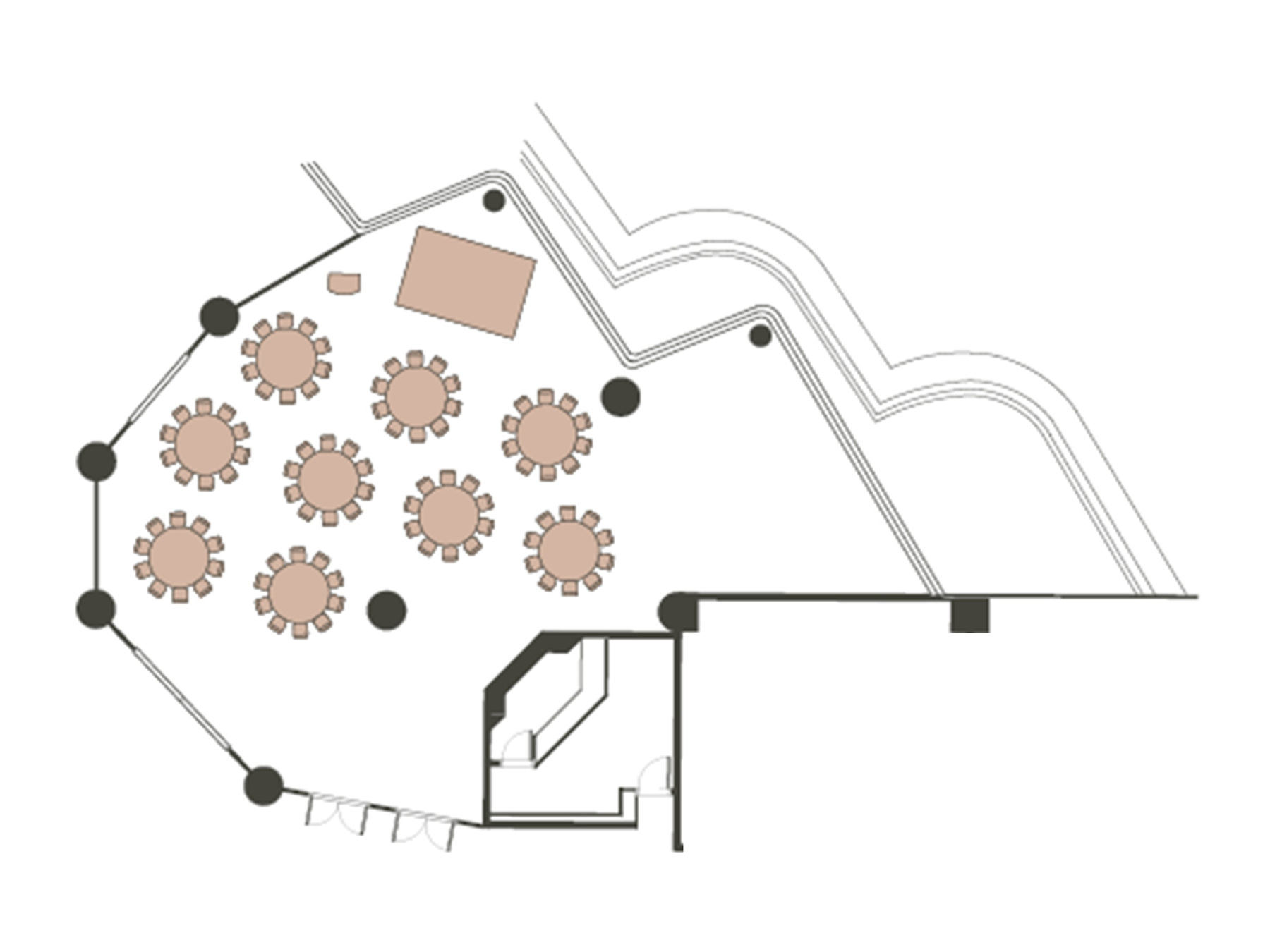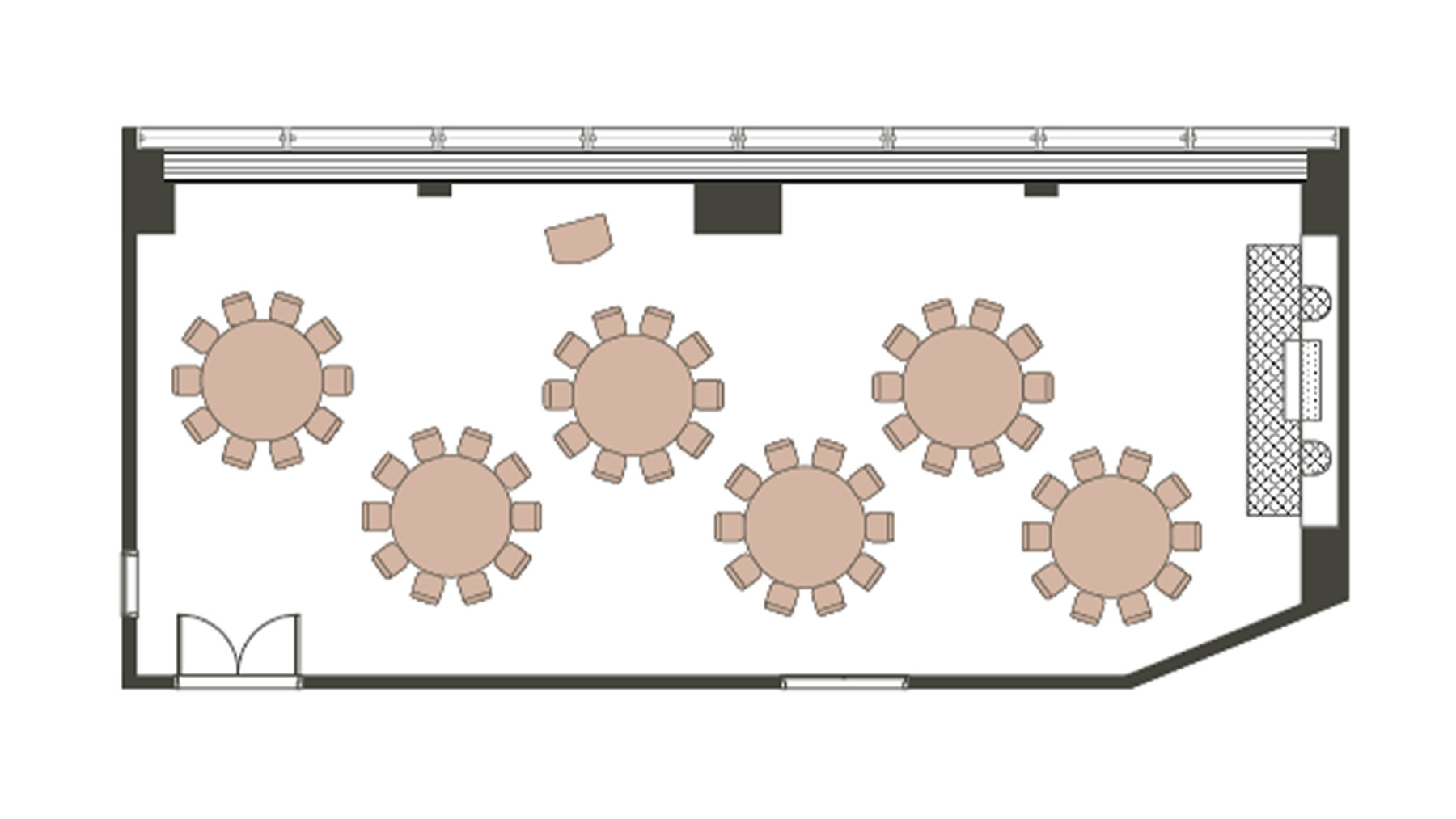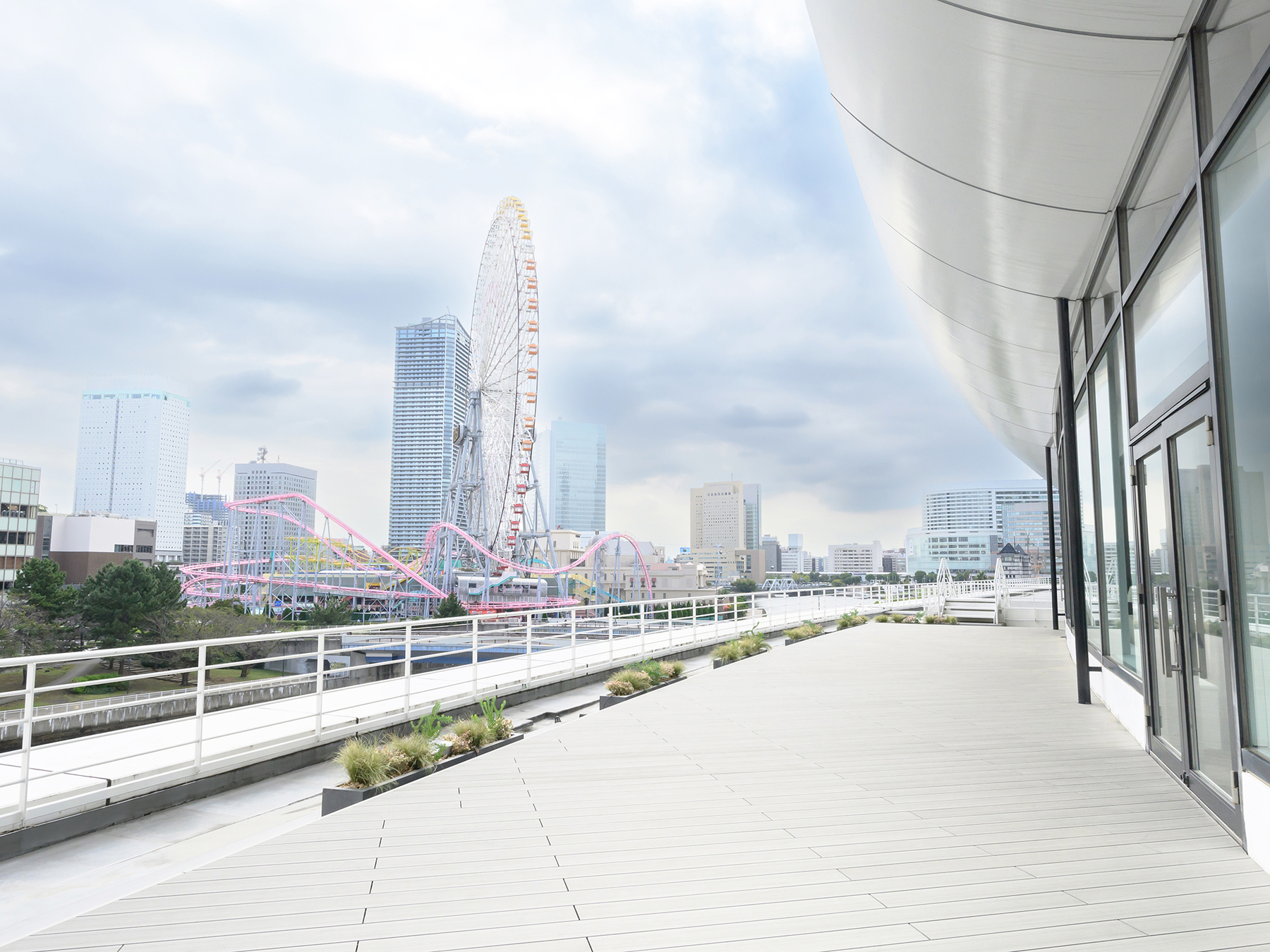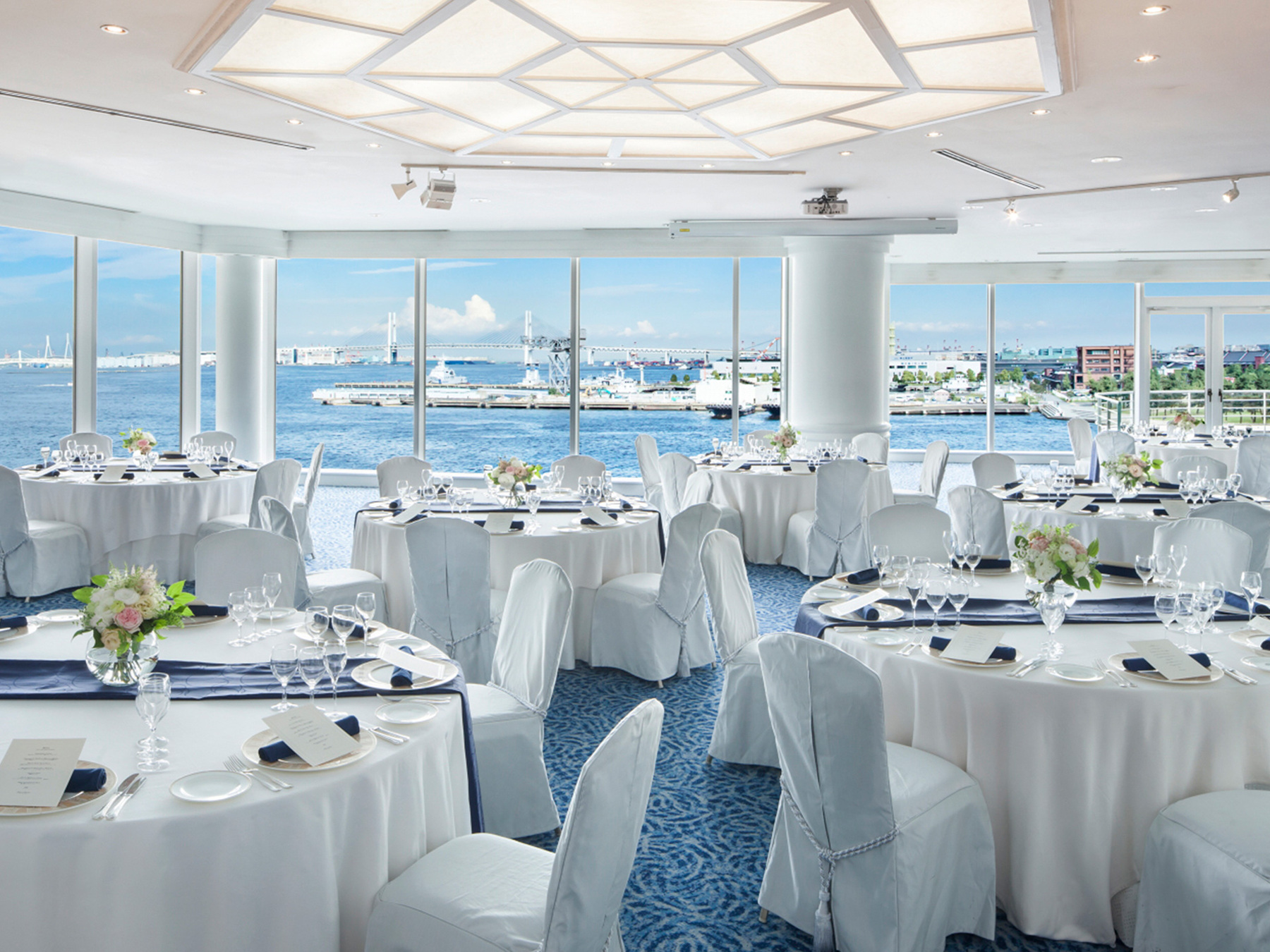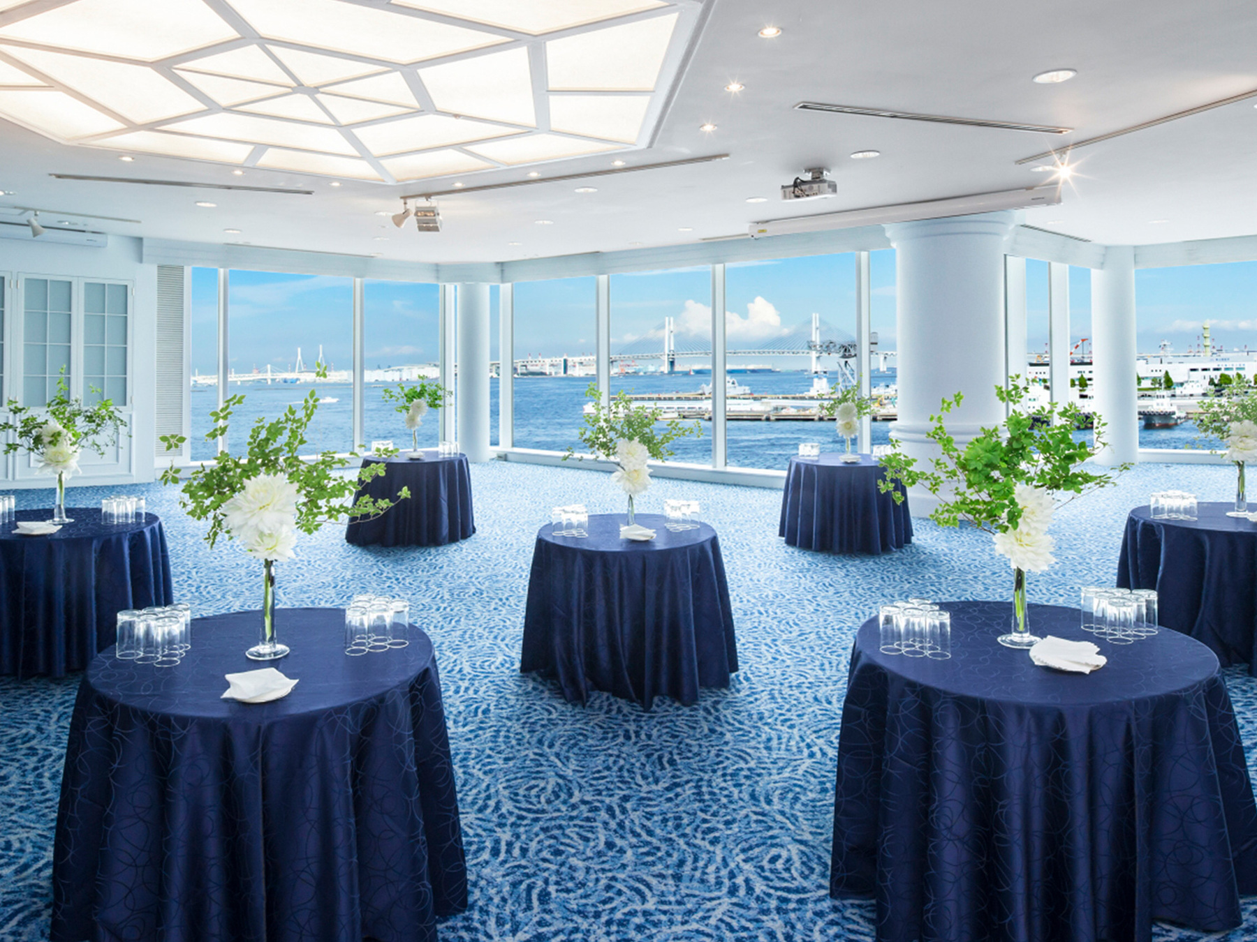 ダイニング、ラウンジ、バルコニーという3つのエリアを擁するユニークな会場です。横浜港を望む屋外バルコニーからは、ベイブリッジをはじめ大観覧車や赤レンガ倉庫などみなとみらいの美しい景色をお楽しみいただけます。