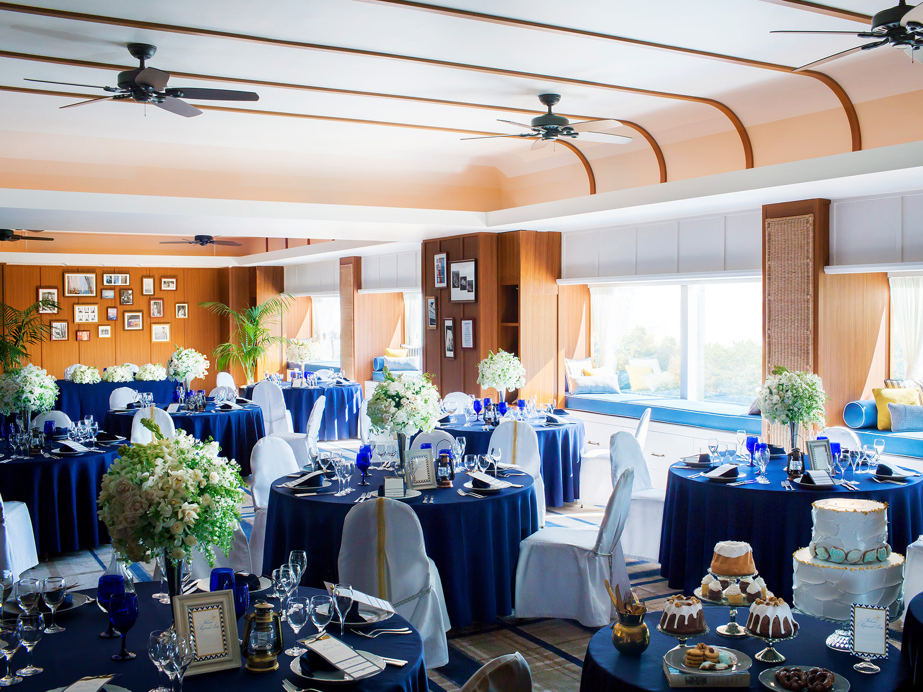 プライベートヨットの船室をイメージした会場です。落ち着いたインテリアとシーリングファン、窓から望むベイエリアの景観がリゾート感を演出します。