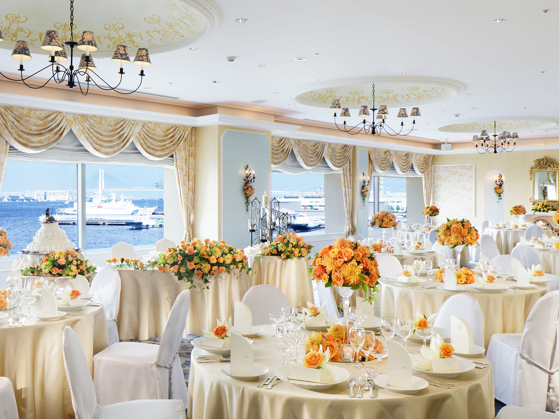 明るく爽やかなエーゲ海をイメージした会場です。ベイブリッジを背景にしたパノラミックな海が一望できます。海のブルーと太陽のイエローが織りなす、開放的でさわやかな空間は、エーゲ海に浮かぶ島々の別荘を思わせます。