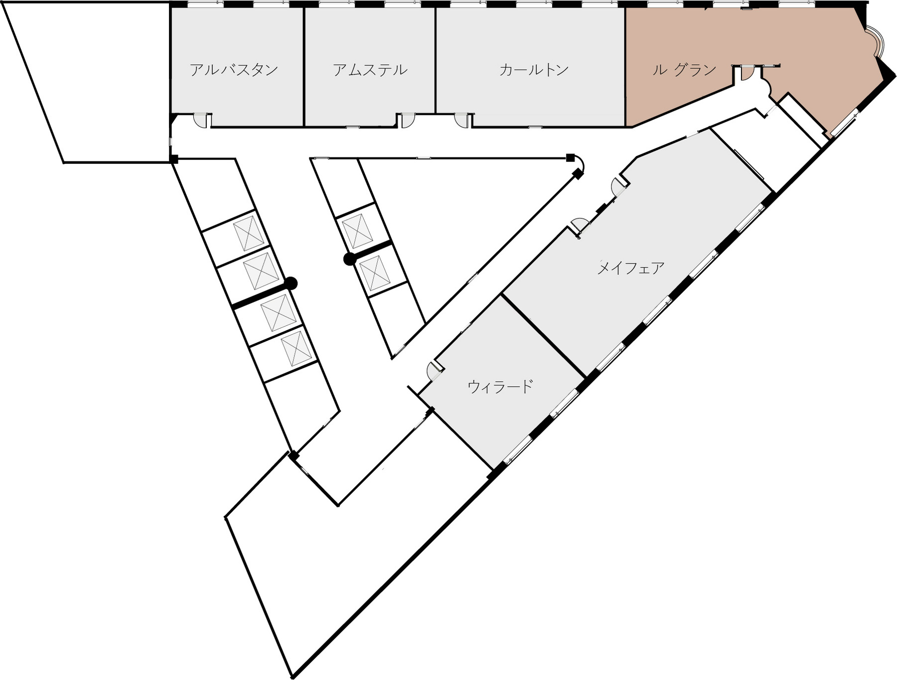 パリのオペラ座前にあるホテルの名をとった「ル グラン」は三方を窓に囲まれ、山下公園、横浜港、ベイブリッジのそれぞれ異なる眺望が楽しめます。15名様までのご会食に、あるいは30名様までの立食形式のパーティにご利用いただけます。