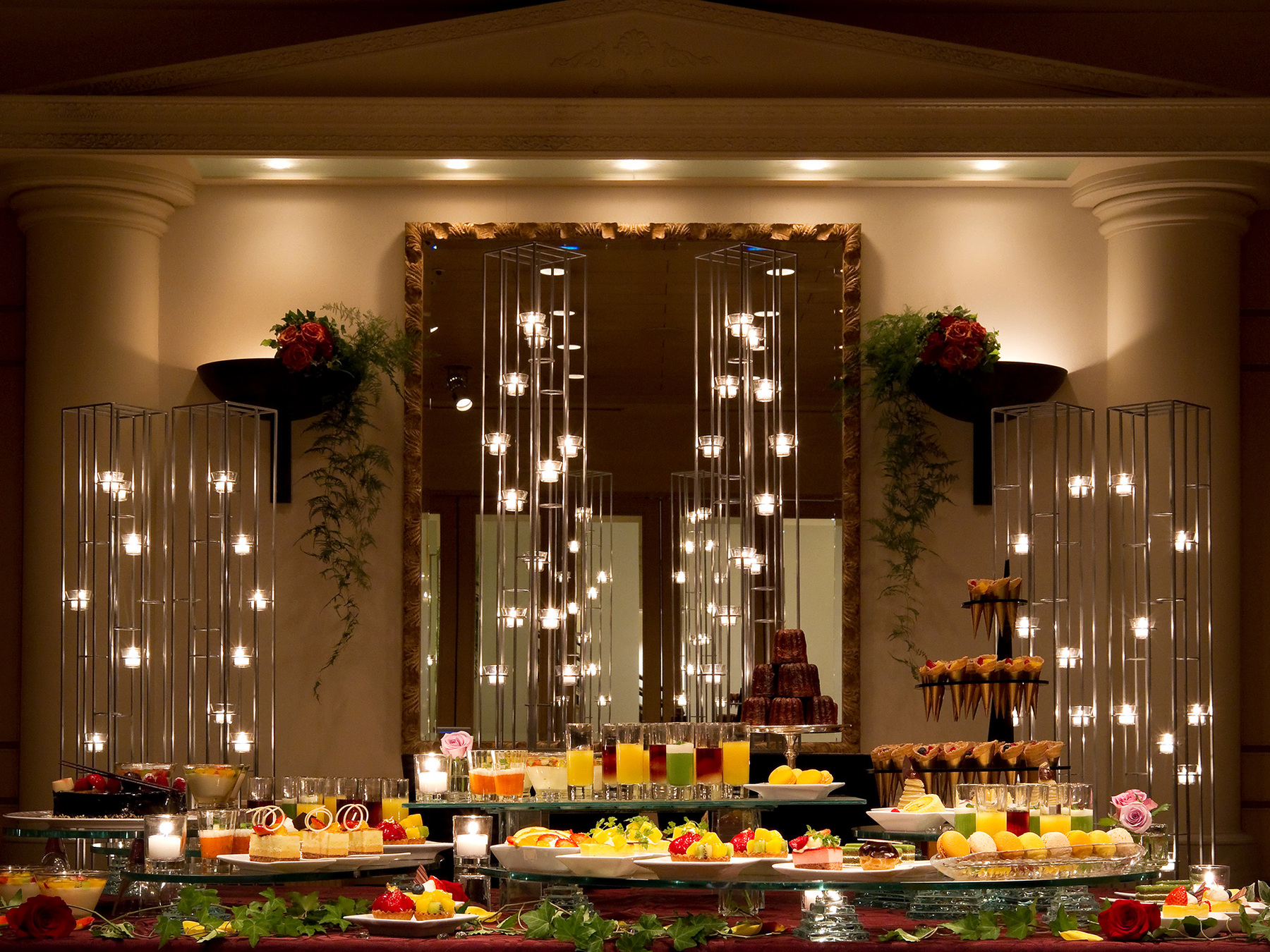 果てしなく続くベイビューを一望する明るく開放的な会場です。昼間は光輝く海を、夜は煌めくイルミネーションをお楽しみいただけます。会場内にはバーカウンターも擁し、バーテンダーがカクテル等をご用意する演出も可能です。