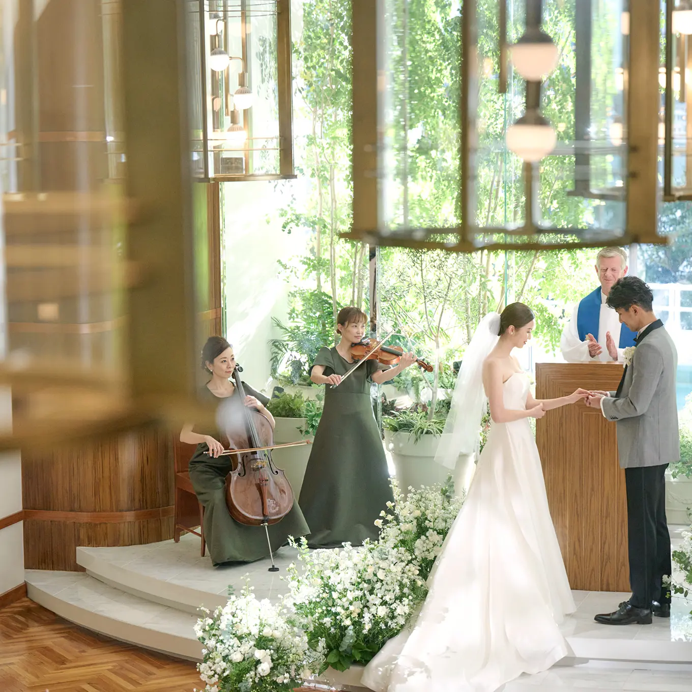 祭壇に立つふたりの、こだわり抜いた衣裳のディテールや、儚く透けるベール、ナチュラルな肌つやを、柔らかな自然光がそっと引き立てます。神秘的な空気の中にあたたかみが重なり、「ありがとう」「おめでとう」そんな想いが自然に交わる、ふたりらしい挙式が叶います。