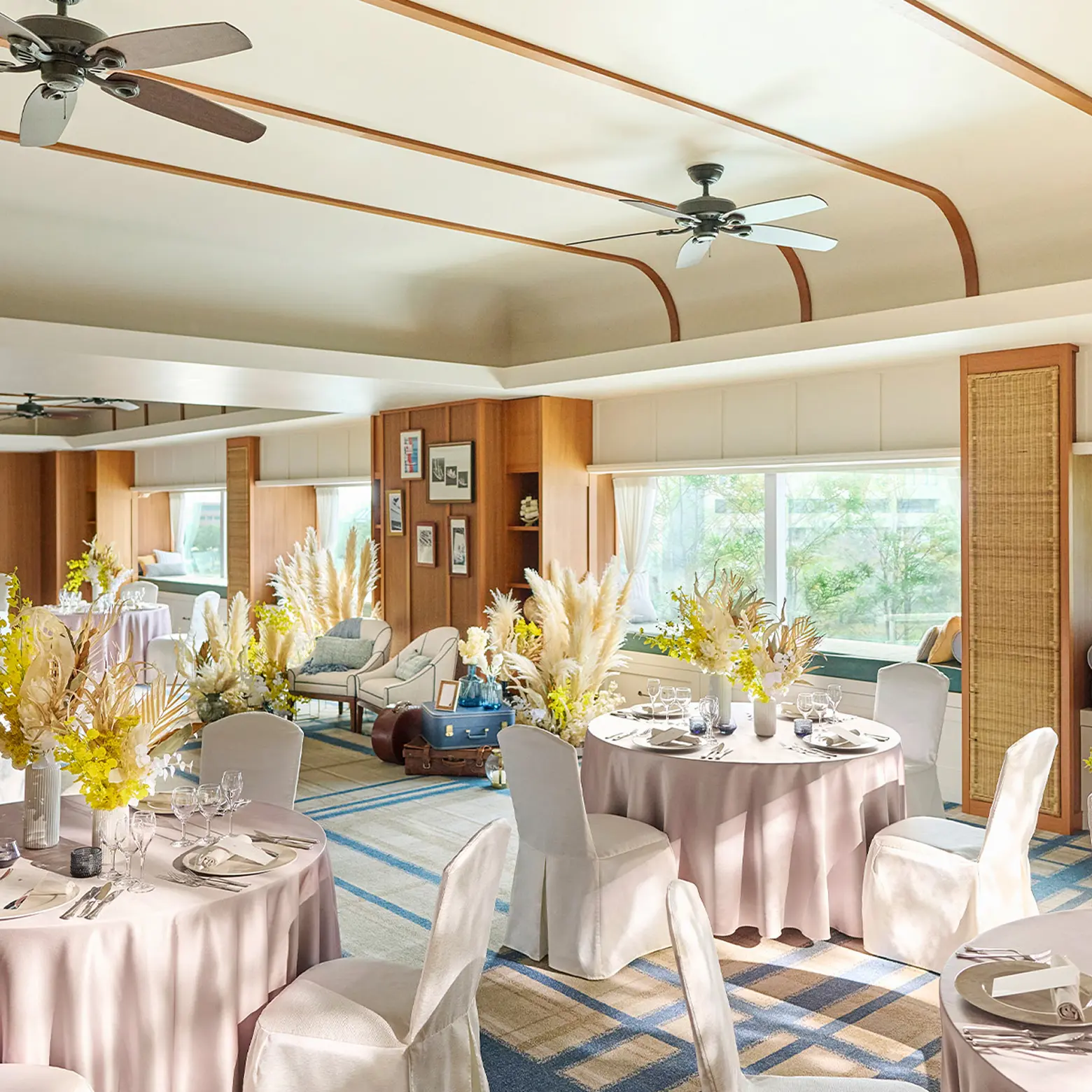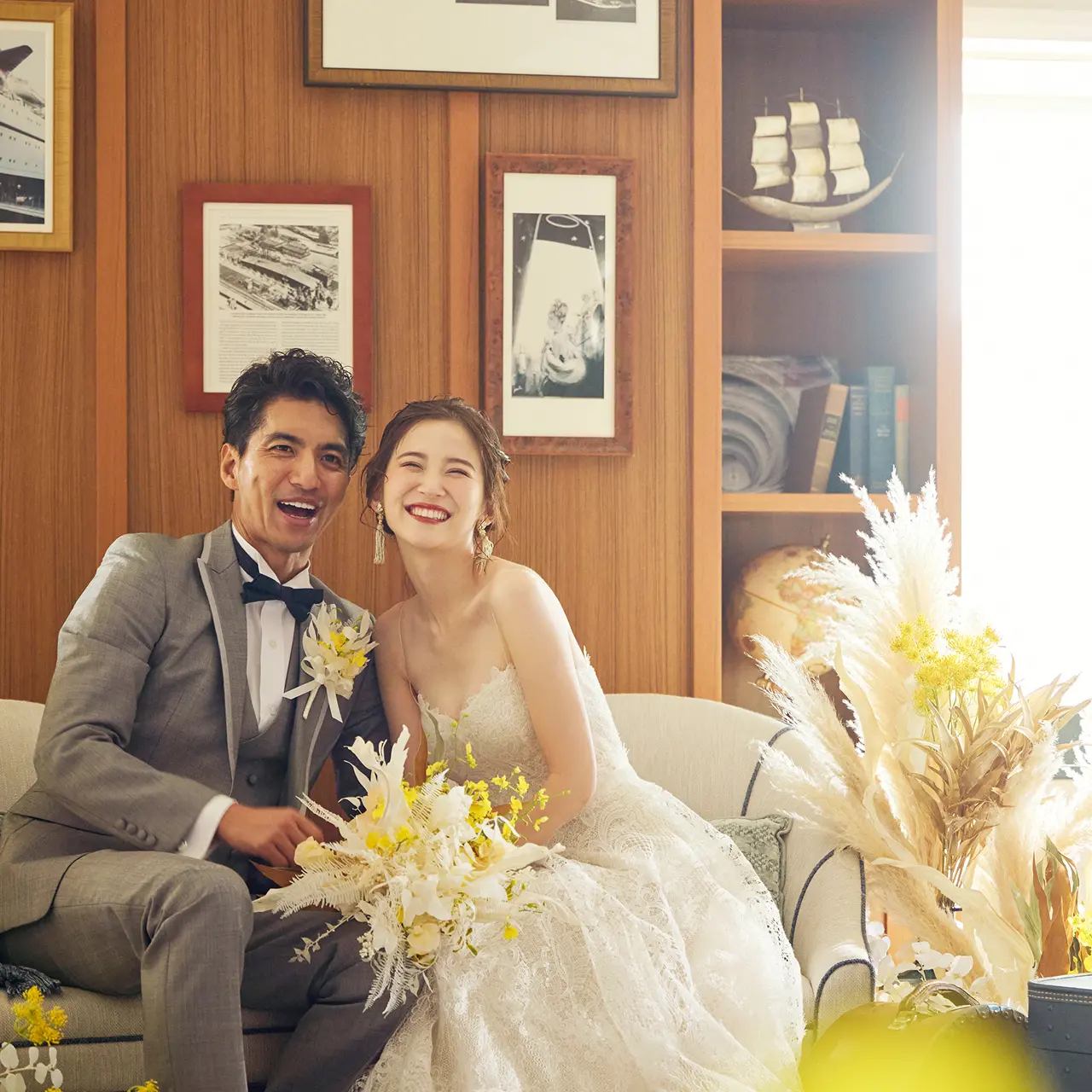 壁に掛かる航海の記録や、ゆったりと回るシーリングファン。一歩足を踏み入れれば、そこはプライベートヨットのキャビン。船窓を模したミラーなど、遊び心溢れるデザイン空間が、おふたりとゲストを特別な航海へといざないます。