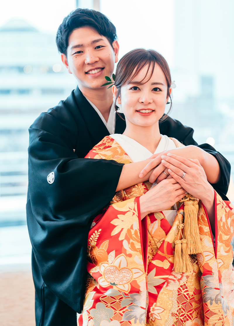 お色直しの色打掛や、ふたりの好きな楽曲を沢山詰め込んだBGM、横浜ならではの引出物や三連時計もこだわりのポイントです。
